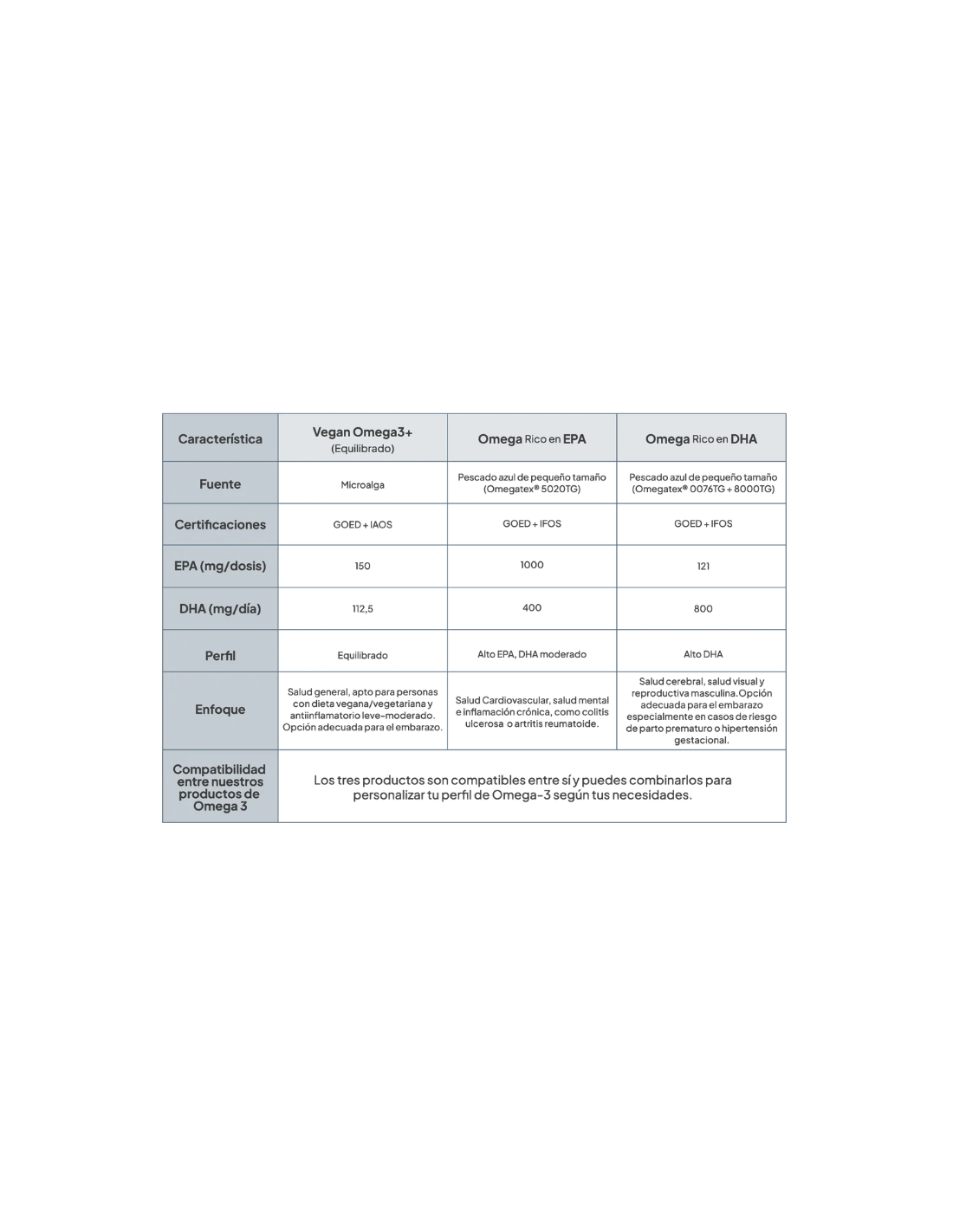Está compuesto de aceites de pescado Omegatex® 0076TG y 8000TG que provienen exclusivamente de aceites corporales de peces salvajes concretamente de anchoas, sardinas y caballas de los océanos Pacífico, Atlántico o Índico Occidental. Los aceites de pescado Omegatex® 0076TG y 8000TG cumplen con los exigentes estándares de la organización internacional GOED y está certificado por IFOS, garantizando transparencia y calidad en cada lote de aceite.