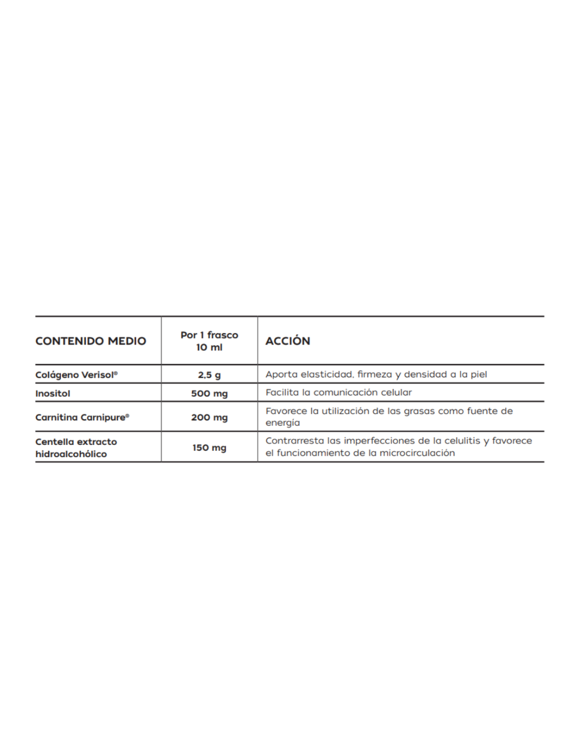 Fórmula de acción 4 en 1 que actúa sobre la densidad y la elasticidad de la piel del cuerpo gracias al Colágeno Verisol®, sobre la comunicación celular gracias al Inositol, sobre la microcirculación gracias a la Centella y sobre las imperfecciones de la celulitis gracias a la acción combinada de todos los ingredientes.